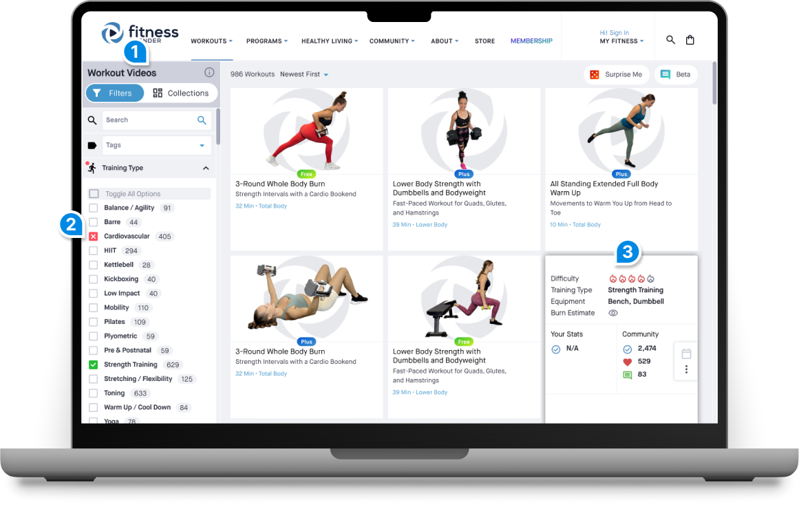 A quick survey highlighted the key pieces of information members wanted to see at a glance. Tapping or hovering on a workout card revealed details without loading the video page.